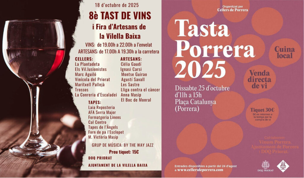 En el cas de Porrera, el tradicional Tasta Porrera es trasllada al mes d’octubre, concretament al dia 25 d’aquest mes a la plaça Catalunya de la vila. L’esdeveniment compta amb la participació de tots els Cellers de Porrera, maridats amb cuina local. El tiquet té un preu de 30€, dels quals se’n descomptaran 5€ en el cas que els participants comprin vi a l’espai de venda directa habilitat per a l’ocasió.